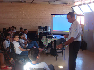 A palestra ocorreu no turno vespertino, e contou com 21 alunos do ensino fundamental. A tarde de hoje estava muito quente, a exemplo de ontem; o que torna a palestra mais difícil de ser conduzida por nós e assimilada pelos alunos. Em virtude disso, os alunos estavam um pouco inquietos, e desejosos de ir para casa mais cedo; contudo, apesar do problema já mencionado acima, foi muito bem conduzida pelo Cb F. Castro e acredito que a mensagem foi repassada aos alunos. Enfim, muito obrigado a todos os professores que nos ajudaram e a todos os alunos que assistiram a palestra.